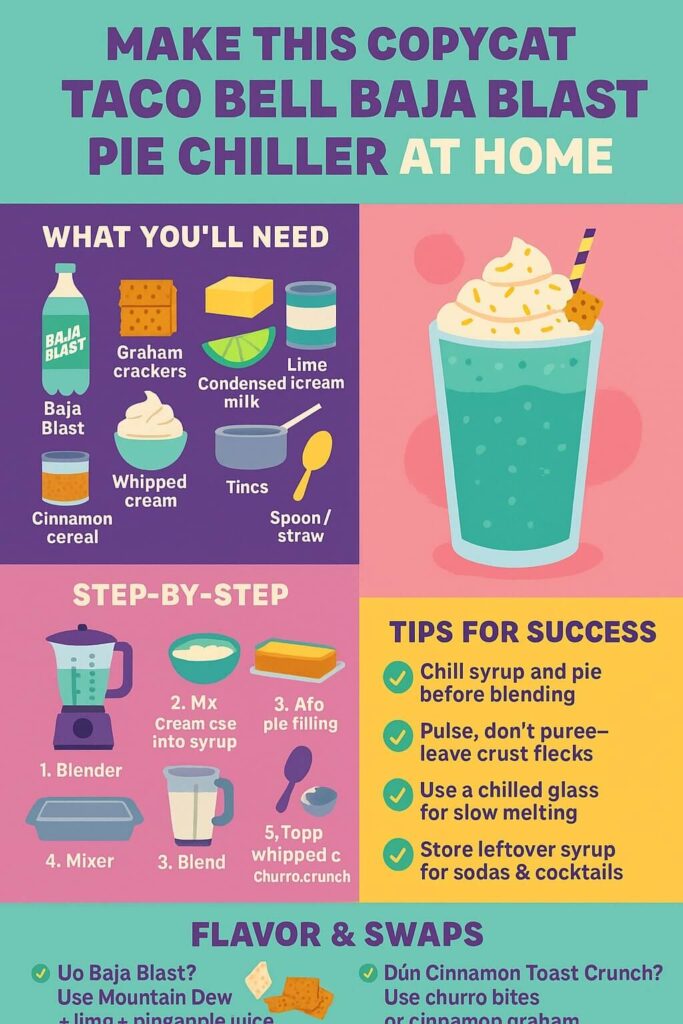 Start by simmering down Baja Blast soda into a tart, teal syrup that locks in that tropical lime kick without watering down your shake. While it chills, whip up a quick no-bake pie filling with cream cheese, lime, and your homemade syrup, then layer it over a graham cracker crust and let it firm up in the fridge.