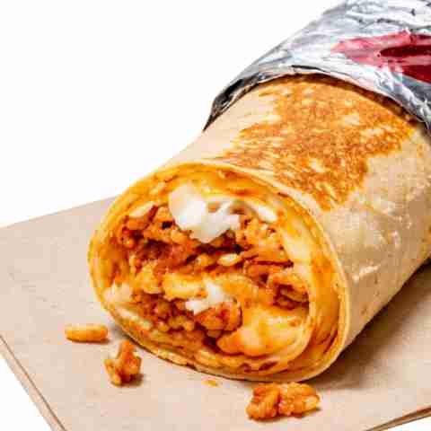 Brown the ground beef in a skillet, drain any excess fat, then stir in the tomato paste, water, and seasonings and simmer briefly until thick and saucy, keeping it warm. Mix the warm cooked rice with garlic powder, onion powder, dried herbs, sugar, and salt until lightly seasoned. Stir together the mayo, sour cream, chipotle, lime juice, sugar, and garlic powder to make the sauce, then gently melt the cheese with milk and jalapeño brine over low heat until smooth. Spread sour cream down the center of a tortilla, layer on the seasoned rice, beef, chipotle sauce, and nacho cheese, then roll it into a tight burrito. In a skillet, melt shredded cheese in a circle, press a second tortilla on top to fuse, then place the burrito in the center, wrap it again so the cheese is on the outside, and grill until lightly golden and sealed. Slice in half and enjoy hot.